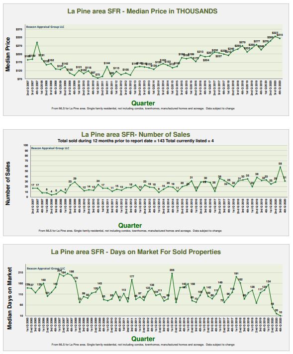 La Pine's single family residential median sales price was $325k with 17 days on market and a current inventory of .3 months.