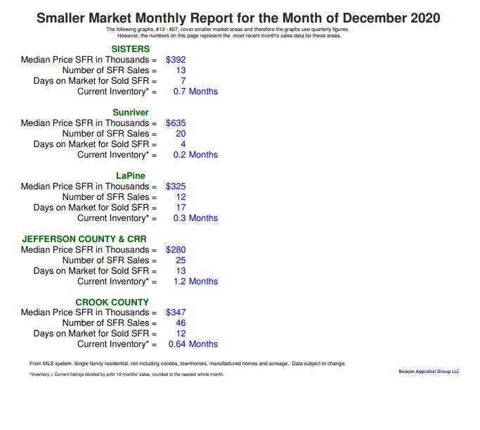 In this Beacon report you will see information about the housing market from 1997-2020. Median sales price trends in Bend and well as Sunriver and La Pine, Oregon.