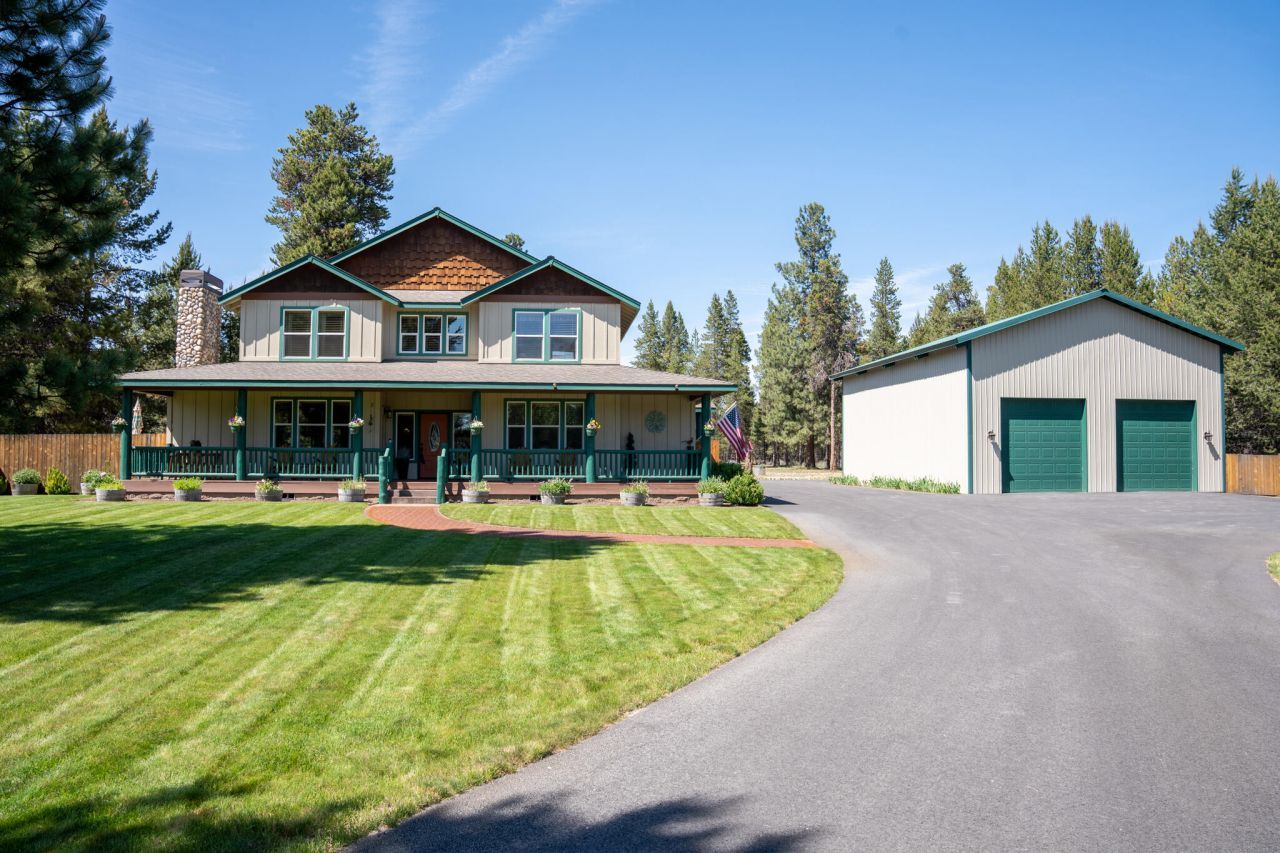 This tranquil La Pine farmhouse offers modern comfort and rustic charm, set on a spacious, manicured lot surrounded by towering pines. The beautifully designed two-story home features an inviting open-concept layout, a cozy wood-burning fireplace, and a covered patio with a beautiful fenced backyard. A large detached shop provides ample storage or workspace, while the private, fenced-in yard ensures peace and privacy. Lovingly updated, this home features a new oversized asphalt driveway and parking area, new paint inside and out, beautiful new wide plank engineered hardwood flooring, and stunning knotty pine trim. With easy access to the outdoors, it is a rare find that checks all the boxes- come and discover this quintessential Central Oregon home for yourself!