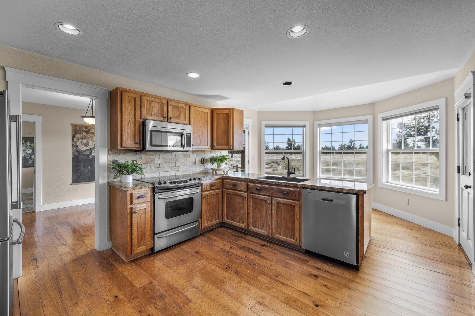 Single-level home in the Starwood community with access to trails, dog park, playground, and RV storage. This 3 bed, 2 bath home offers 1,541 sq ft on ~0.30 acre with an attached 2-car garage. Interior features include hickory hardwood floors, travertine tile, granite kitchen countertops, stainless steel appliances, and solid doors. Large living room with wood-burning stove, plus dining area and eat-in nook. Spacious mud room adds functionality. New exterior paint (2025). Exterior includes wraparound porch and a stamped and stained concrete patio that backs to open space for great mountain views.