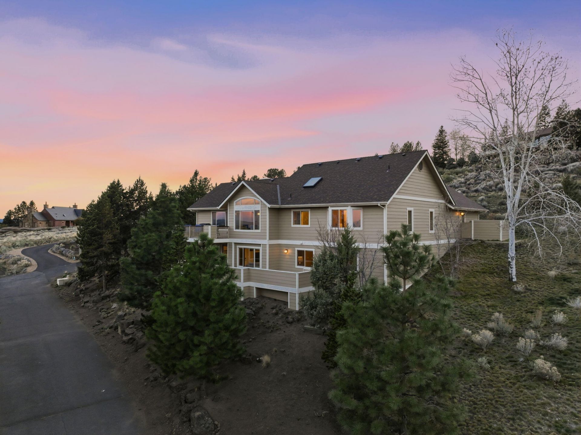 Tucked at the end of a quiet cul-de-sac on a private drive, this Bend retreat offers sweeping city views, Paulina Peak vistas, and a front-row seat to Pilot Buttes 4th of July fireworks! Designed for everyday living and effortless entertaining, the main level features vaulted ceilings, engineered hardwood floors, and a sunlit great room. The kitchen blends function and style with quartz counters, skylight, island with gas range,and breakfast bar. The vaulted primary suite includes a roomy walk-in closet and a spa-like bath with soaking tub and walk-in shower. Flexible lower level with second living space, wet bar, 2 bedrooms, and full bath, plus refinished hardwood floors-ideal for family, friends, work-from-home, or multi-gen living. Step outside to a view deck or unwind on the enclosed lower patio with hot tub hookups. With direct access to trails and parks, this home delivers the Bend lifestyle in full. Extensive upgrades: new carpet, windows, treatments, siding, roof, and HVAC.