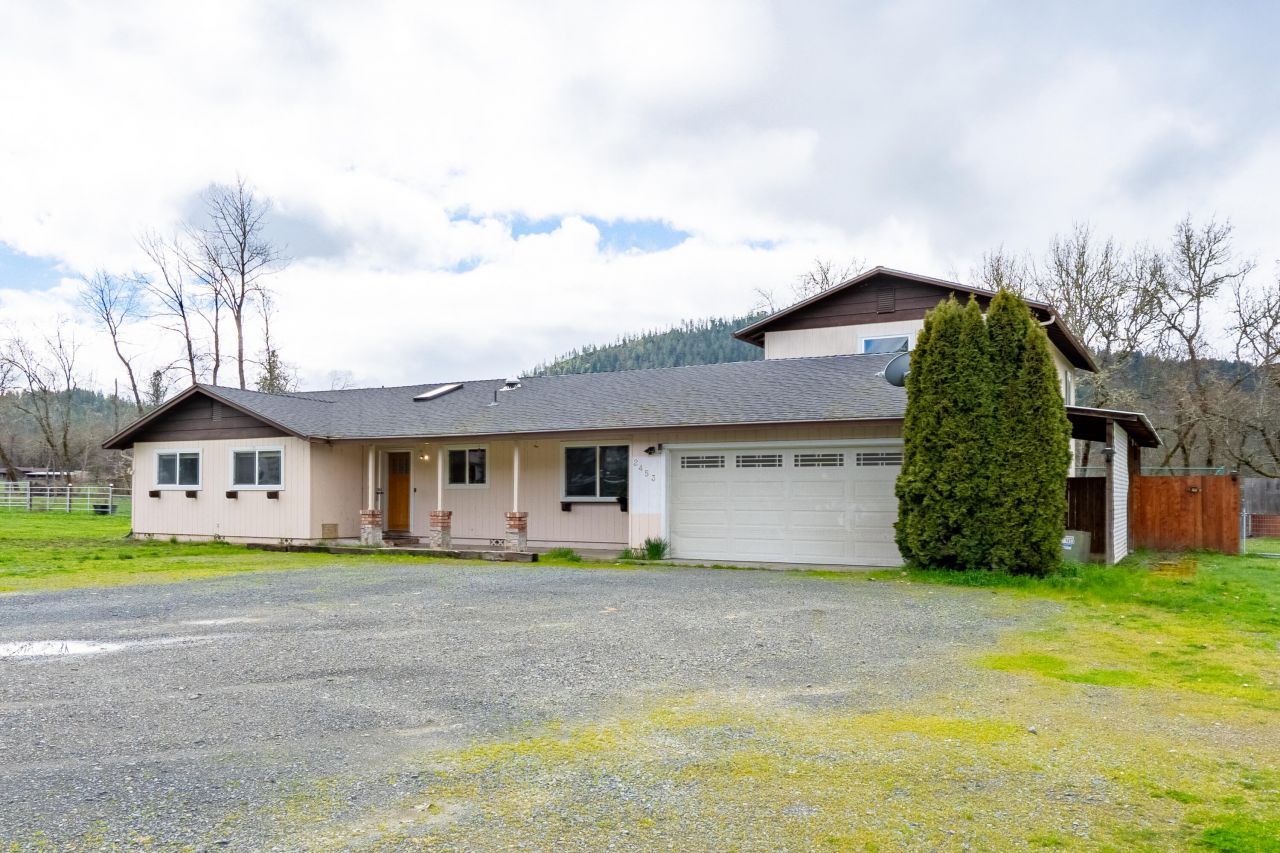 HUGE REDUCTION!!! Welcome to this beautiful home in Grants Pass! Previously a Foster Home, this property combines town convenience with countryside tranquility. It features five spacious bedrooms and four full bathrooms, including two primary suites--one upstairs and one on the main floor. The upstairs second primary en suite has an office nook and ample closet space, perfect for conversion into a private apartment with a separate entrance. The living room has a beautiful beamed Knotty Pine cathedral ceiling and two separate French doors, one leading to the spacious fenced backyard, the other leading to the upstairs. For animal lovers, theres a three-stall barn, a paddock, and a fenced arena. The large shop offers extensive storage and RV parking, including covered spots with electric hookups. Come see all the possibilities this home offers!