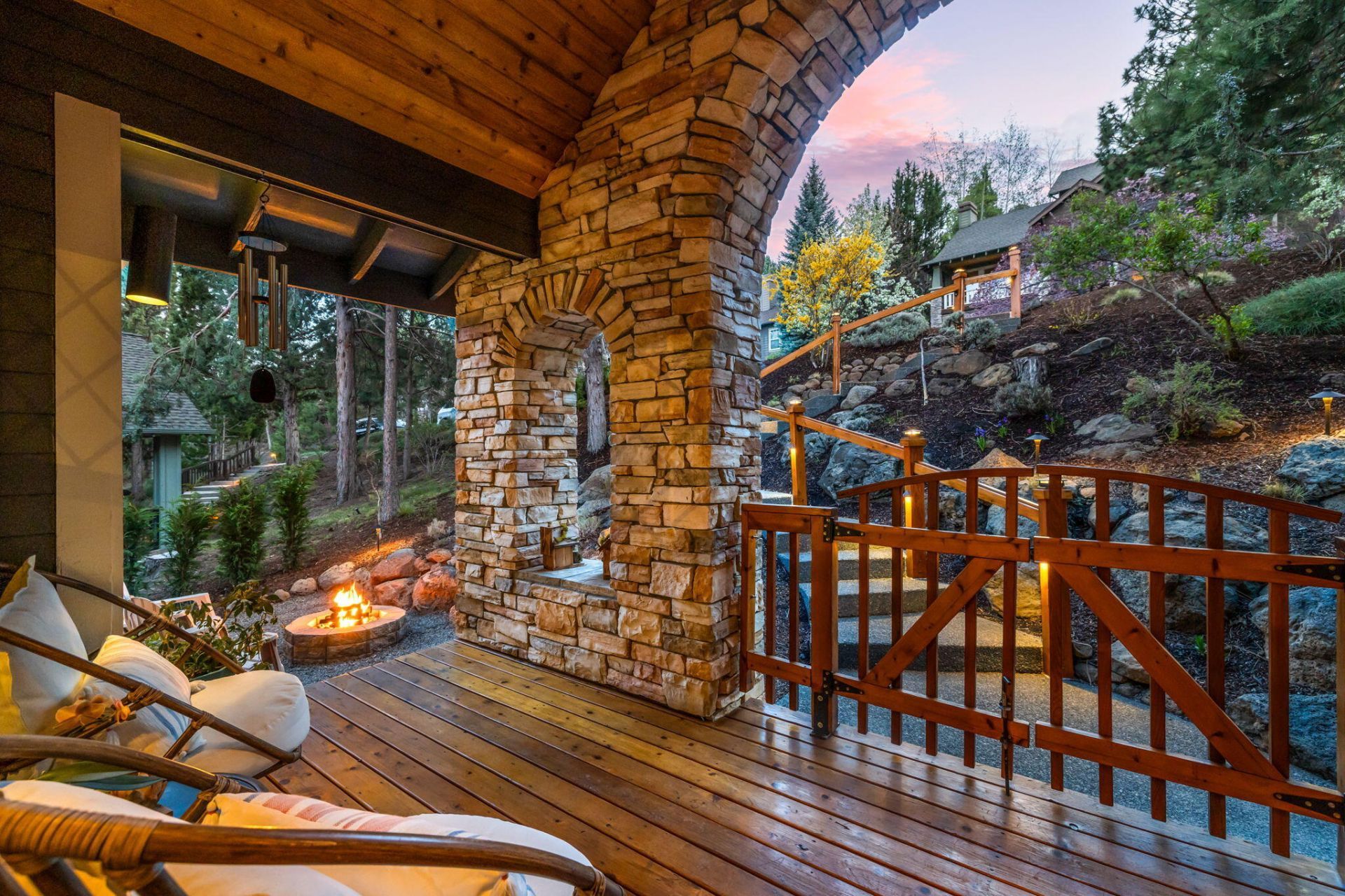 Storybook charm welcomes you to this Tudor-style home in the desired Awbrey Village neighborhood, where arched doorways, cottage-grid windows, and a warm, inviting entrance set the tone. Enjoy views of Pilot Butte and beautiful sunrises from the expansive back deck. The 2020 remodeled kitchen features a quartzite waterfall island countertop, wine fridge, and dedicated prep space. Vaulted 20-ft ceilings, hardwood floors, custom beams, and a gas fireplace anchor the great room. Designed for entertaining, outdoor spaces include multiple decks, a covered outdoor kitchen, private hot tub, and a lower-level outdoor lounge area. Flexible layout offers a main-level office/bedroom, a primary suite with a deck access, and lower-level bedrooms with a rec room. Alley-access garage, RV/boat parking, and workshop in garage. Close to trails, parks, and minutes to downtown and Bend amenities.