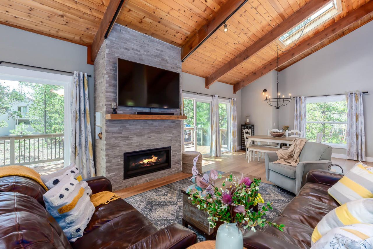 Beautifully renovated home in the heart of Sunriver. Featuring soaring wood ceilings and picture windows; numerous updates like the fully remodeled kitchen, flooring, primary bath and windows make this turnkey furnished home ready to enjoy. Great separation of space with a bedroom/bathroom upstairs on the main level, and two guest bedrooms on the lower level. Cozy up next to the romantic gas fireplace in the winter & enjoy the minisplit A/C upstairs on summer days. A private hot tub, large deck and spacious paver patio amongst the trees invite outdoor living. 2-car garage with room for a vehicle and plenty of storage for toys! Float the Deschutes River or experience Sunrivers tennis/pickleball courts, Fort Rock Park, SHARC and the owners only North Pool - all within minutes your door. Keep all to yourself or use as an active vacation rental for investment opportunity; start living your Sunriver dream today!